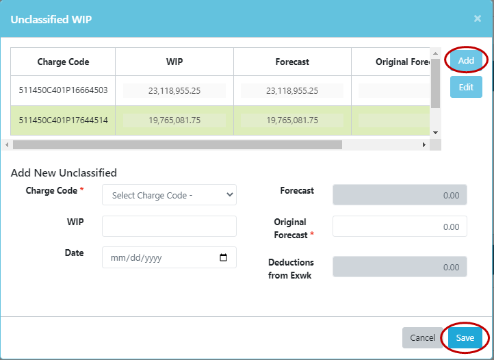 Note: System displays the Charge Code, WIP, Forecast, Original Forecast, and Deductions from Extra Work fields