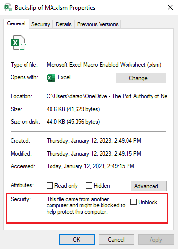 iii). At the bottom of the General tab, select the Unblock checkbox and select OK